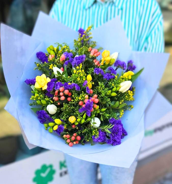 Discover the beauty of late summer with a unique bouquet that captures all the warmth and vibrancy of the season. The Indian Summer Bouquet is soft, playful, and naturally elegant. A harmonious mix of white freesias, yellow solidago, sky-blue statice, coral hypericum berries, and fresh greenery creates a vivid composition loved by both women and men.