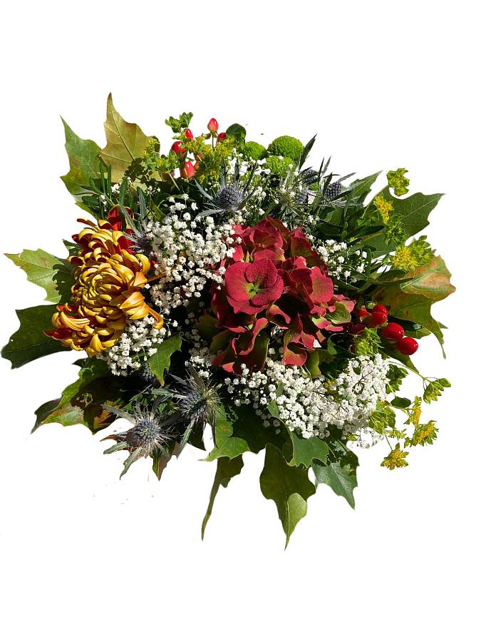 This beautiful bouquet combines the rich tones of autumn with the natural texture of oak leaves. Hydrangea, eryngium, chrysanthemums, gypsophila, and hypericum come together in a refined composition that feels fresh, natural, and full of seasonal charm. Oak leaves add a unique autumn accent, making this bouquet perfect for home décor or as a thoughtful gift.