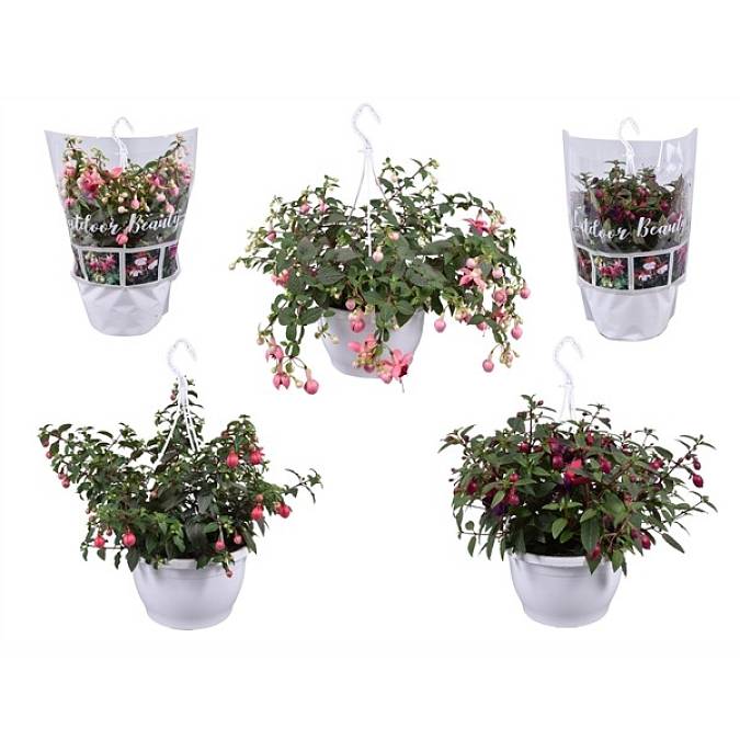 Fuchsie v závěsném květináči je oblíbená sezónní rostlina s bohatým kvetením ve směsi barev – od růžové po fialovou. Její typicky dvoubarevné květy ve tvaru sukýnek tvoří elegantní převisy, které krásně vyniknou na balkoně, terase nebo v altánu. Výška cca 35 cm, květináč 25 cm – připravena k zavěšení.