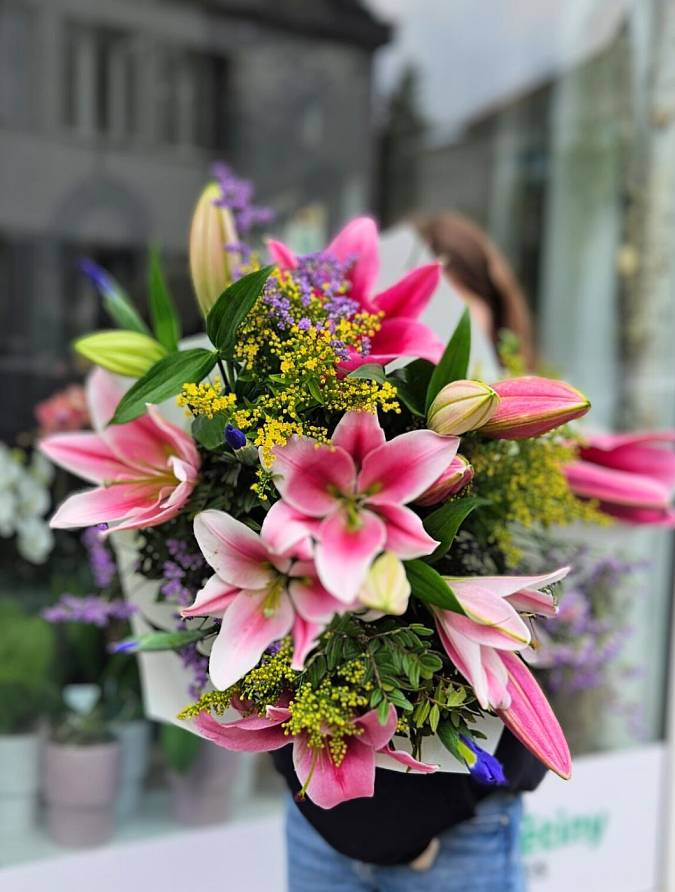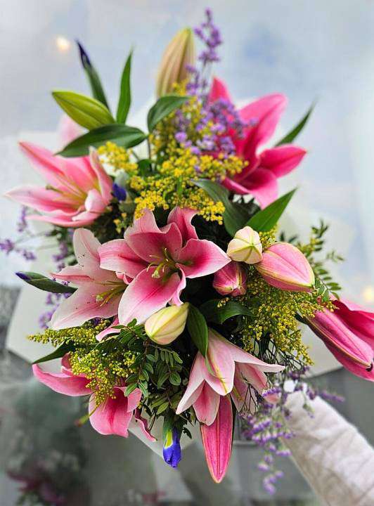 Královské lilie nesou punc vznešenosti a luxusu. Tato kytice Hvězdná Lilie je krásně doplněna zářivě žlutým solidágem, vzdušnou alstromerií a nádherně modrými irisy, které spolu se svěží zelení tvoří dokonalou harmonii. Květiny jsou uvázány do klasického, kulatého tvaru. Udělejte radost své hvězdě touto nádhernou kyticí.