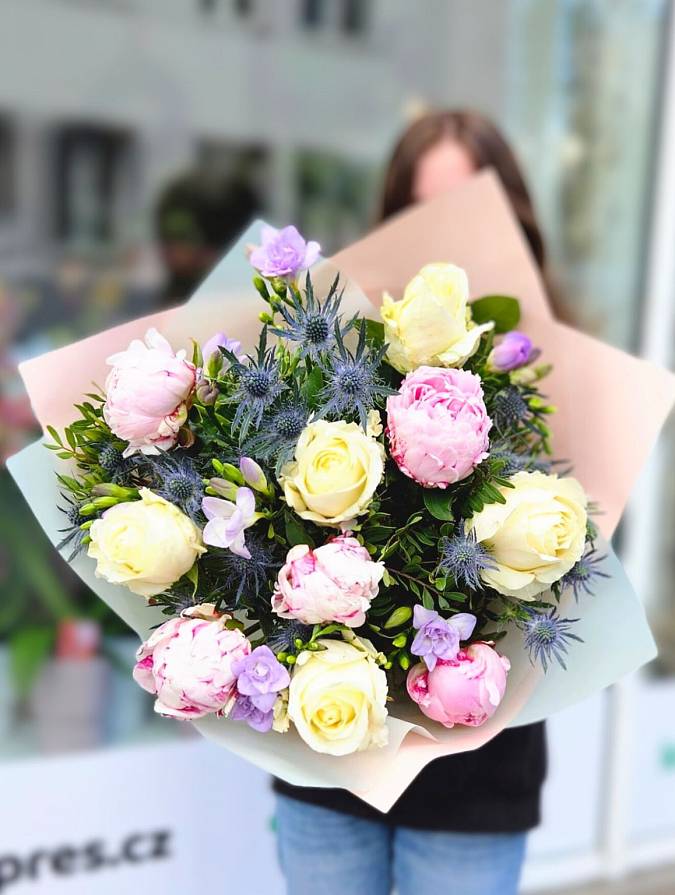 Pivoňky jsou krásné květiny s plnými květy přinášejí do kytice svěžest s nádechem starých časů. V této kytici je doplňují jemné a překrásně vonící frézie