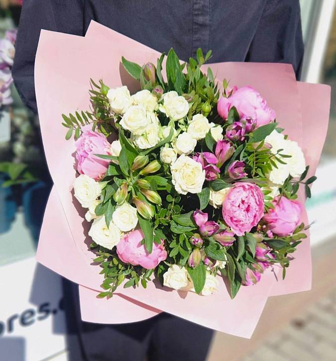 ✔ Složení: pivoňka, trsová růže, alstromerie, zeleň