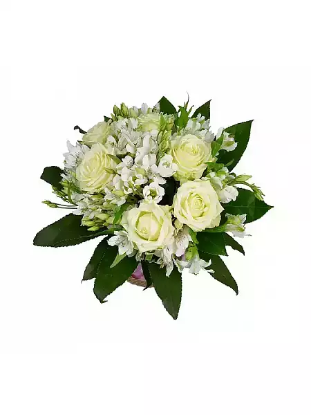 Tato úchvatná kytice spojuje jemné fialové růže a karafiáty, které tvoří základ kompozice, s bílými velkokvětými a trsovými růžemi, jež vytvářejí nádherný kontrast. Vzdušnost a něžnost dodávají drobné kvítky gypsofily (nevěstin závoj), zatímco svěží zelené listy salalu (libavky) završují celkový harmonický dojem. Elegantní a romantická kompozice je ideální volbou pro každého, kdo chce vyjádřit lásku, obdiv nebo jen potěšit blízkou osobu.
