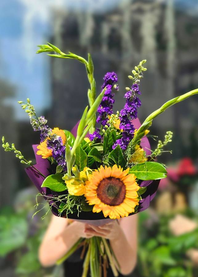 Letní kytice se slunečnicemi, gladioly a modrým delfiniem – radostná, svěží a plná pozitivní energie.