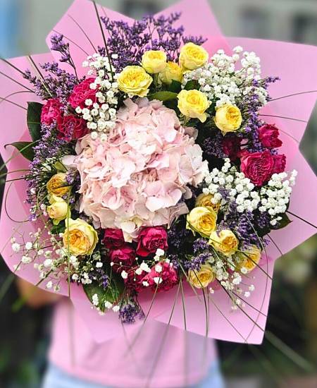 - Hortenzie – bohaté kulovité květy, které dodají kytici objem.