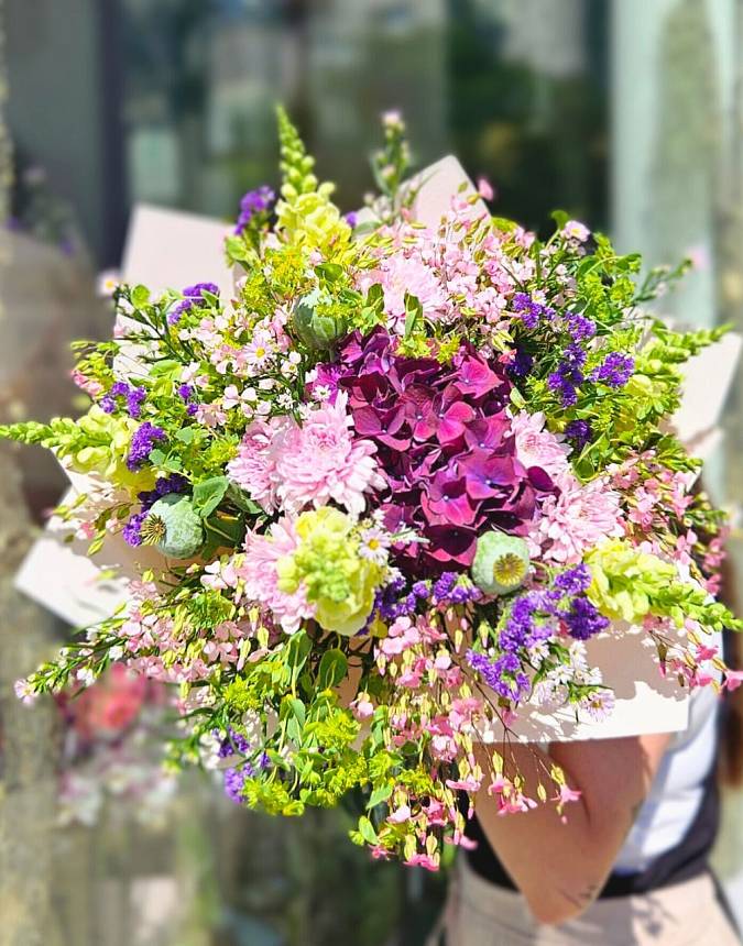 Tato romantická letní kytice je ideální volbou pro každého, kdo miluje jemné pastelové tóny a originální květinové kombinace. Dominantou vazby je bohatá fialová hortenzie, kterou harmonicky doplňují růžové chryzantémy, statice, limonka, makovice, hledíky (antirrhinum) a další luční květy. Kompozice působí vzdušně, přirozeně a svěže, září letní náladou a jemností.