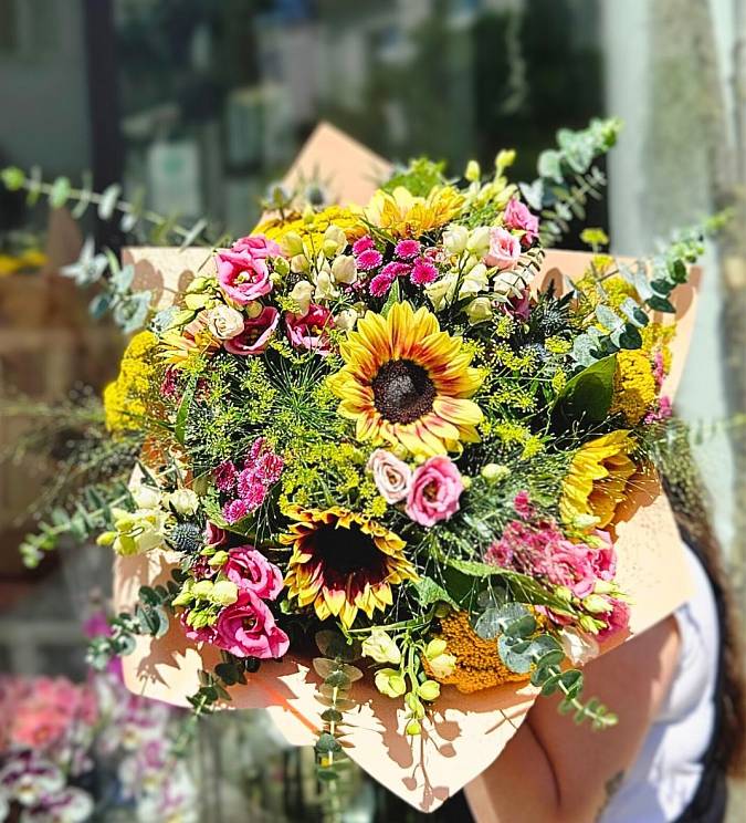 Tato bohatá luční kytice je jako závan teplého letního dne – plná barev, energie a radosti. Dominantní slunečnice přinášejí sluneční světlo a optimismus, zatímco růžové eustomy a santiny vnášejí do aranžmá něžnost a hravost. Kompozici doplňují osvěžující akcenty v podobě kopru, eukalyptu a dalších typických letních květin. Každý detail je pečlivě sladěn tak, aby kytice působila přirozeně, svěže a bohatě.
